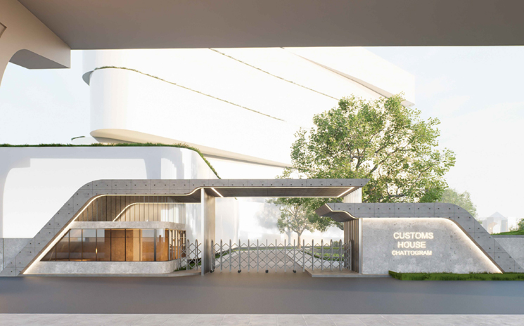 Customs House Chattogram, situated on a 6.75-acre site at latitude 22.3119° N and longitude 91.7987° E, draws inspiration from Chattogram’s long-standing connection to global trade and seafaring. Its dynamic form echoes the flowing hull of a cargo ship navigating the Bay of Bengal, with stacked and cantilevered floor plates that curve organically to symbolize movement, connectivity, and commerce. The design integrates key public and support facilities including a plaza, cafeteria, mosque, and landscaped open spaces, ensuring seamless functionality while creating a strong civic presence.